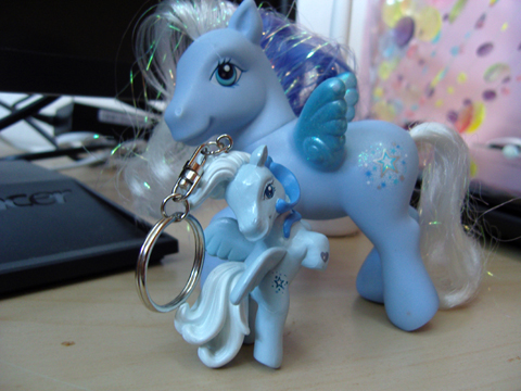 after some pony buys at the fleamarket I checked my „My little Pony – need to be washed and brushed“-box and look what I found! I knew there was something special about the keychain, that I had seen the according G3 pony XD I wouldn’t have expected to find it in a box in my living room, but now the two are together next to my computer, so I can look at them! Thank you so much!